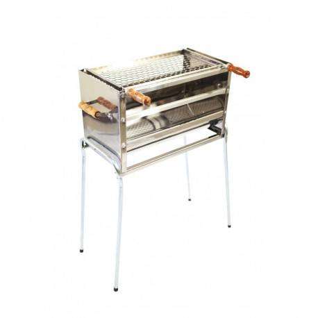 Churrasqueira em aço inox com grelha e pés dobráveis.
