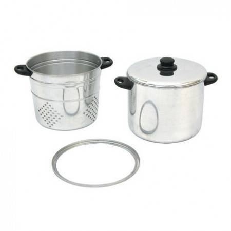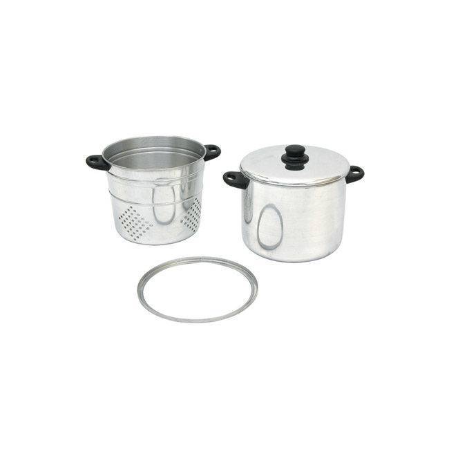 Caldeirão em alumínio polido com escorredor para preparar macarrão e aro para preparar legumes no vapor.