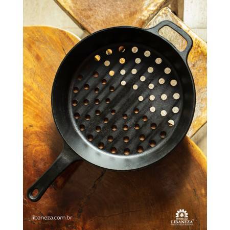 Frigideiras Gourmet Furada Grill 30cm Libaneza em Ferro Fundido Curado a 250° com tinta a Base D'agua que não agride a Saúde e permite a transferência de ferro para os alimentos. Pronto para uso.