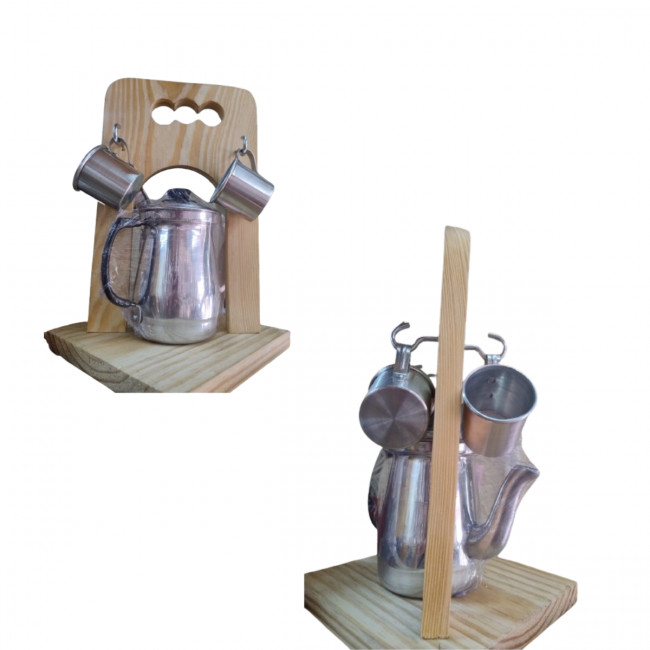 Suporte de madeira decorativo completo, já com as 4 xícaras e 1 bule de alumínio